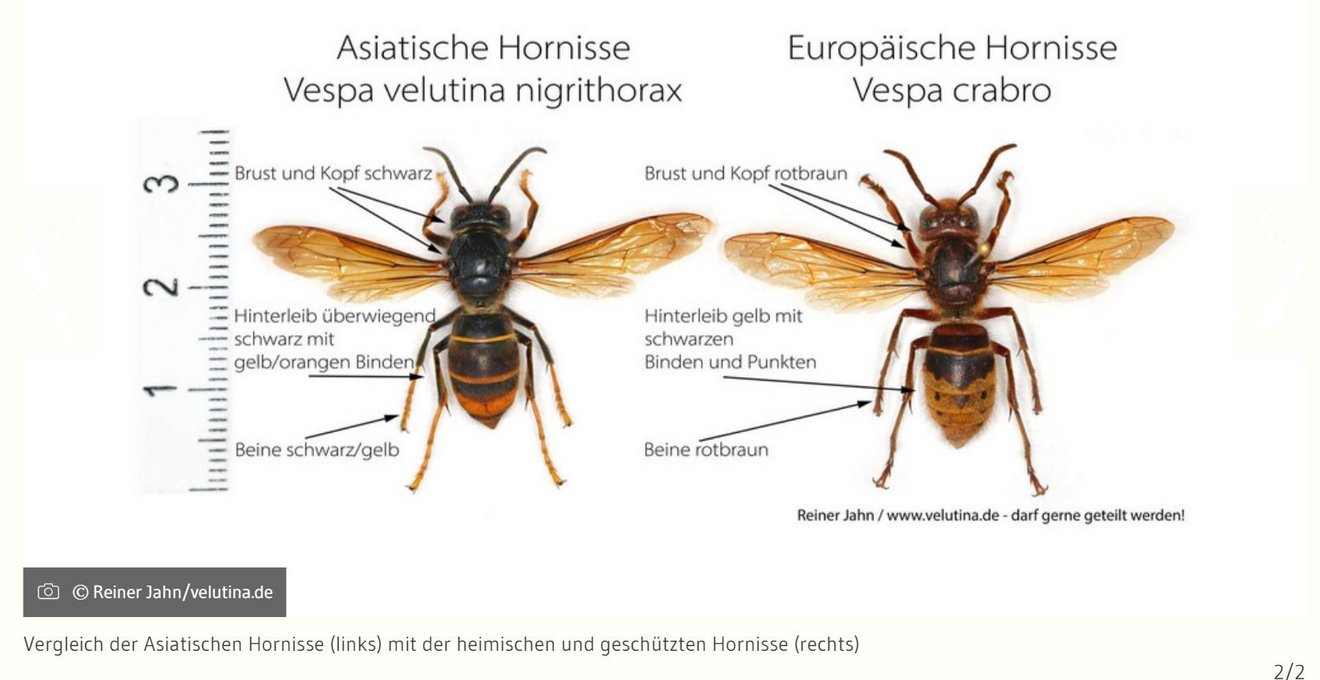 Sichtungen der asiatischen Hornisse sind meldepflichtig und sollen unter der Mailadresse asiatische-hornisse@umwelt.saarland.de gemeldet werden.